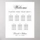 Um simples e minimalista assento de casamento com 7 mesas. O fundo é branco, o texto é preto. A palavra Bem-vindo na parte superior e os nomes da noiva e noiva são escritos em um roteiro caligráfico elegante, o resto em bonés.