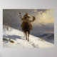 A hunter clad in fur rides a moose down a snowy slope, carrying a spear adorned with feathers. The sky is overcast, adding a dramatic backdrop to the scene.