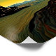 A.I.criou impressão de uma silhueta de uma bruxa com um chapéu alto e um roupão fluindo de forma destacada em uma paisagem com um castelo e casas quentes contra um pano de fundo de céus giros e luas brilhantes.