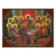 pintura colorida em vermelho e dourada do "último jantar" de simon ushakov. jesus está numa longa mesa retangular com doze apóstolos com halos ouros. esguicho de vinho e bandeja de ouro com pão na mesa em um interior decorado com uma bela fita vermelha. cores brilhantes e pintura lindamente equilibrada com um fluxo adorável de halos ouros criando um padrão decorativo, estilo ícone, e pintado no século XVII, uma pintura iconográfica brilhante e ousada do novo testamento do último jantar.