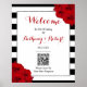 A coleção de casamento chic moderno luxe apresenta um clássico fundo listrado em preto e branco acentuado com belas rosas vermelhas rubi e uma moldura de folha de prata falsa. Este sinal de boas-vindas é fácil de personalizar e será a sinalização perfeita para qualquer casamento, chá de noiva, festa de aniversário, celebração de noivado ou qualquer outra ocasião especial. O texto do modelo e o código QR são fáceis de personalizar para tornar este sinal único para o seu evento especial.