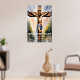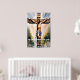A cruz é a prova de que o amor pode ser forte o suficiente para carregar o peso do mundo. Jesus de cabelo comprido e de barba, olhando para cima com uma expressão contemplativa. Ele tem uma ferida na testa, e há uma marca vermelha parecida com uma cruz na pele. Ele está vestindo um pano branco enfiado sobre seus ombros, e um colar de corrente é visível em seu pescoço. O fundo mostra uma cruz de madeira com cordas vermelhas, e o céu acima está nublado.