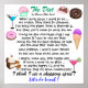 Nem me faça começar ... ; ) Eu nunca tive que fazer dieta séria embora eu nunca pudesse comer tudo. Agora, estou ouvindo, "Bem, nossos corpos mudam à medida que envelhecemos.... Uma vez que você passa uma certa idade, é mais difícil para o peso do perder... blá blá blá." Eu sei de várias coisas que faço errado. Primeiro, como extremamente tarde; no entanto, se comer mais cedo, vou dormir e não faço nada. Então, o que há com a teoria de que você não deveria comer depois de um certo tempo? Acho que estou queimando todas as calorias antes de jantar. Oops, eu não como o dia todo, então sim, eu sei, meu corpo está dizendo, "Armazene a gordura. Ela está a passar fome." Eu poderia escrever um livro aqui; no entanto, eu vou acrescentar que um grande erro que eu cometo é comer chocolate com dois pedaços de chocolate coberto de amendoins nas raras ocasiões em que estou sozinho e quero ler um mistério, então... Posso desistir desses momentos maravilhosos e ler... ou dizer, "A vida é curta demais para não se permitir de vez em quando!" (Claro, vou dormir enquanto os comia e lendo... e não posso começar a dizer-lhes que bagunça é...... ENTÃO.... Aproveite! (Copyright 2009. Poesia: A Dieta. Direitos de autor registrados detidos pelo autor Sharon Rhea Ford. Qualquer reprodução ou revenda será uma violação dos direitos autorais.)
