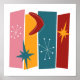 Faça uma declaração em suas paredes com este poster ousado da era atômica. Com seus retângulos, estrelas e bumerangue cor-de-rosa, laranja, azul e vermelhos, é certo que ganha algumas "wows"!