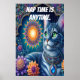 Um gato majestoso adorado com joias que olham com inteligência sob um vibrante e estrelado céu noturno. Cercado por intrincados padrões, flores coloridas e um sol ornamentado, a cena explode com charme místico e brilhantismo artístico. Gato Whimsical Olhando debaixo de um céu estrelado à meia-noite. A hora da soneca é a qualquer momento.