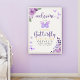 Bienvenido a su evento con este cartel de bienvenida de personalizable para baby shower. con este hermoso diseño con Tematica de Mariposas y flores en acuarela en tonos Rosas y Purpuras. con linda tipografia dorada con la frase " A LITTLE BUTTERFLY IS ON THE WAY" un fondo amarillo claro es ideal para recibir a esa dulce niña que viene en camino!. Personaliza este elegante y sencillo cartel de bienvenida para Baby shower agregando sus propios detalles.