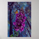 A Foxglove e a Borboleta são uma pintura digital original. Torre vibrante e brilhante de flores roxas e cor-de-rosa sobe em direção a uma fila de árvores. Uma borboleta preta e laranja decola, céu azul com nuvens ventosas no fundo.