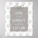 Poster de tipografia no estilo do livro digital com a frase, "A CASA não é COMPLETA sem CABELO CAT." Faux fita e botão em um fundo que tem pegadas de animais de cinza. Concebidos por Rycky Creations; elementos de Pixelscrapper.