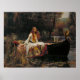 A Senhora de Shalott. Esta pintura ilustra o poema de Alfred Tennyson "A Dama de Shalott". O tecido que a senhora fez numa torre perto de Camelot é o que se passa sobre o barco. Mas ela trouxe uma maldição a si mesma olhando diretamente para Sir Lancelot. Com sua mão direita ela deixa a corrente ancorando o barco. Sua boca está ligeiramente aberta, pois canta "sua última canção". Ela olha para um crucifixo na frente dela. Ao lado dele estão três velas, muitas vezes usadas para simbolizar a vida. Dois explodiram. Isso sugere que sua vida terminará logo, enquanto ela flutua pelo rio. John William Waterhouse (1849-1917) era um pintor de Pré-Raphaelite Inglês mais famoso por suas pinturas de personagens femininas da mitologia grega e artruriana. A Waterhouse foi um dos últimos artistas pré-Raphaelitas, sendo mais produtiva nas últimas décadas do século XIX e nas primeiras décadas da 20, muito depois da era da Irmandade Pré-Raphaelita. Por isso, ele foi chamado de "o Pré-Raphaelite moderno" e incorporou técnicas emprestadas pelos Impressionistas Franceses em seu trabalho.