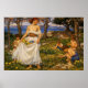 Waterhouse balances softness and clarity through warm skin tones, crisp whites, and bright yellow and blue wildflowers set against cool water and distant hills. The drifting fabric, scattered petals, and dappled light create a sense of movement without breaking the calm mood. Part pastoral, part poetic, this painting turns spring into a story about innocence, abundance, and the simple joy of being outdoors when the world comes back to life.