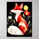 A stylized red fox with closed eyes is depicted amid floral elements, including two flowers and surrounding leaves. The background is dark, highlighting the geometric design and vibrant hues of the fox and flowers.