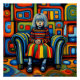 A.I.criou impressão de uma criança com uma expressão solene e olhos tristes sentados em uma poltrona, vestindo um equipamento multicolorido vibrante que combina com os padrões geométricos no fundo.