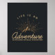 Poster com uma ilustração dourada sobre fundo de cinza preta. Projetado com uma ilustração de uma montanha com raios solares brilhando por trás. A tipografia diz: "A vida é uma descoberta de sonho de uma Aventura".