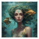Uma cena aquática serena mostra uma mulher rodeada de água e peixe, seu cabelo fluindo graciosamente ao seu redor. A luz filtra através da água, destacando a sua presença etérea e mística.
