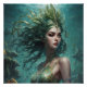 Uma cena aquática serena mostra uma mulher rodeada de água e peixe, seu cabelo fluindo graciosamente ao seu redor. A luz filtra através da água, destacando a sua presença etérea e mística.