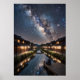 Uma aldeia pacífica repousa silenciosamente sob um céu noturno cristalino, onde a majestosa Via Látea se estende brilhantemente através do cosmos. Estrelas brilham e brilham, suas reflexões dançando suavemente na superfície calma de um canal estreito. As casas de madeira tradicionais alinham a borda da água, luz quente brilhando suavemente do seu interior, convidando e sereno. Em uma doca de madeira, uma figura solitária fica contemplativamente, olhando para cima na infinita extensão, perdida em um momento de maravilha silenciosa. A cena se sente profundamente emocional e cinemática, capturando a beleza da solidão e a vastidão do universo.