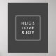Arte simples, na moda, moderna de poster de férias com a moderna e mínima tipografia, com a frase "Hugs Love & Joy" em branco, com uma simples borda branca e limpa. A saudação pode ser facilmente personalizada para um toque pessoal. Um design de natal ousado, minimalista e contemporâneo, com cinza de carvão, apresenta a cor para se destacar da multidão nesta temporada de festas! #natal #decor