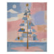 An abstract, cubist-inspired painting featuring a stylized Christmas tree constructed from blocks of light blue, white, and tan geometric shapes. The tree is centered and symmetrical, adorned with small golden ornaments and topped with a prominent star. The background is composed of broad, layered brushstrokes in a muted pastel palette of dusty rose, pale pink, and soft sky blue, resembling patchwork fields or atmospheric blocks of color. Two circular white shapes, possibly moons or large ornaments, appear in the upper corners. The overall effect is a modern, minimalist take on a traditional holiday subject, characterized by simplified forms and a cool, soft color scheme.