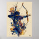 This abstract fluid ink artwork captures an archer in the act of drawing a bow, surrounded by flowing layers of blue, gold, and warm hues. The composition emphasizes focus, balance, and controlled movement while maintaining a clean, contemporary aesthetic. Ideal as modern wall art for interiors, studios, and creative environments.