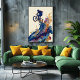 An abstract fluid ink artwork capturing a mountain bike rider suspended in motion above a cascade of flowing color. Dynamic splashes of blue, gold, violet, and warm earth tones express speed, balance, and elevation, while the light background enhances contrast and clarity. This contemporary piece blends athletic energy with refined abstraction, making it ideal wall art for modern interiors, studios, and creative spaces.