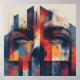 Intense eyes emerge from geometric shapes in red, orange, and blue. Abstract digital art with splatter texture and vertical lines. Contemporary design perfect for modern decor, posters, or creative projects. Artistic expression that conveys emotion and sophistication.