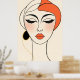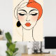 Das Bild ist ein abstraktes minimalistisches Porträt mit einem stilisierten Frauenkopf. Der Kopf ist mit einfachen schwarzen Linien umrandet und die Oberseite des Kopfes ist mit einer halbkreisförmigen Form bedeckt, die mit orangefarbener Farbe gefüllt ist. Nahe der linken Seite des Kopfes befindet sich ein großer schwarzer Kreis, der durch eine gestrichelte gelbe Linie verbunden ist. Der Hintergrund ist in einem schlichten Cremeweiß gehalten, was die Einfachheit und den Fokus auf die abstrakten Elemente verstärkt.