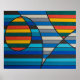 Este desenho abstrato geométrico impressionante apresenta faixas ousadas em tons vívidos de azul, cinza, preto e creme, contrastado com formas circulares e triangulares vibrantes cheias de vermelho, amarelo, verde e laranja. Os contornos pretos e divisões agudas criam equilíbrio e estrutura, enquanto as cores vivas adicionam energia e atração moderna. Uma composição contemporânea que combina ordem com vibração divertida.
