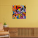 Esse é um clássico abstrato geométrico ao estilo da escola abstrato-expressionista, com círculos e ângulos. A cor laranja dominante é combinada com amarelo, tons de azul, roxo, rosa e preto. Foi imaginado com IA.