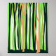 Abstrato, imagem estilizada de uma floresta, com linhas verticais representando árvores em tons de verde, laranja e preto. As formas geométricas e a paleta de cores limitadas criam uma representação minimalista e evocativa de uma paisagem florestal.