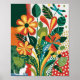 Uma pintura vibrante e abstrato com uma variedade de formas estilizadas de abstrato. O trabalho de arte é preenchido com cores esbatidas e em negrito, incluindo tons de verde escuro, laranja, amarelo, verde e azul. As formas têm pétalas grandes, exageradas, com padrões intrincados, enquanto as tiras são representadas em diversas formas e tamanhos, criando um efeito exuberante e em camadas. O fundo inclui uma mistura de cores sólidas, lavagens de gradiente e bolinhas lúdicas, adicionando profundidade e contraste. O estilo geral é moderno, expressivo e cheio de energia, com forte ênfase em cor e forma, arte vetorial plana, grafite, aquarela acrílica, libélula branca, colagem de efeito de carimbo plano. matizes vermelhos, padrão paisley, libélula branca no canto e um gato bonito