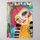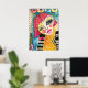 Esta peça de arte original multimídia colorida apresenta uma garota esquisita e caprichosa, com cabelo rosa brilhante sobre um fundo colorido abstrato de cor azul empoeirada e laranja tangerina, com formas semicíricas cor-de-rosa, amarela e verde e listras pretas e brancas e uma variedade de rabiscos.