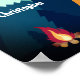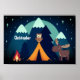 Esta poster de Camping apresenta uma tenda, uma fogueira, uma coruja e alça sob um céu estrelado com uma lua de cheio e montanhas ao fundo.