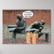 Uma estátua lendo um jornal é esculpida em um banco como uma área artística de assentos ao ar livre. A famosa estátua O Pensador está dobrada ao meio com uma dor de estômago severa. Com dois grandes sacos de papel de fast food aos seus pés, a outra estátua comenta "Acho que você exagerou no combo".