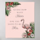 Este poster de jogos tropicais "Adivinhem quantos beijos para a próxima Sra." apresenta ilustrações tropicais flamingas desenhadas à mão a tinta preta, mostrando flamingos rosa, flores de hibisco e jasmim e folhas tropicais. Fundo cor-de-rosa embebido elegante.