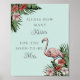 Este poster de jogos tropicais "Adivinhem quantos beijos para a próxima Sra." apresenta ilustrações tropicais flamingas desenhadas à mão a tinta preta, mostrando flamingos rosa, flores de hibisco e jasmim e folhas tropicais. Fundo azul de turquesa elegante.