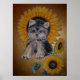 Cachorro bonito e adorável com girassóis num fundo escuro de ouro. Pegue essa linda yorkie e tenha um feliz ano de cachorro!