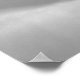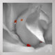 A close-up of a flaming orange and yellow rose desaturated down to a quieter black and white. Only the water droplets sprinkled on its soft grey petals give a hint of the original sunny colors.