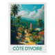 Illustration colorée d’un village de la Côte d’Ivoire entouré de palmiers et de montagnes, avec une touche vintage. Une affiche parfaite pour une décoration murale chaleureuse et exotique.
