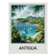 Affiche vintage d’Antigua illustrant une magnifique baie aux eaux turquoise entourée de collines verdoyantes. Des voiliers flottent paisiblement dans le lagon tandis que la végétation luxuriante encadre ce paysage idyllique. Une décoration parfaite pour une touche exotique et dépaysante.