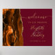 Este elegante poster de boas-vindas do casamento moderno apresenta uma cor de água laranja queimada, design com brilho de ouro falso. Personalize facilmente o texto dourado sobre fundo burgundo, com os nomes da noiva e do noivo em caligrafia manual sobre uma grande e grande cinza carvânica.