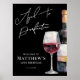 Aged To Perfection Birthday Welcome Sign. Greet guests with this refined wine-themed welcome sign featuring a mix of rustic handwritten script and classic serif fonts for a warm yet polished look. “Aged To Perfection” appears at the top in a stylish blend of the two font styles, followed by the birthday person’s name and age for a personal touch. A watercolor black and white wine bottle with a glass of rich red wine sits on the right side, adding a modern twist to the classic theme. The black background gives the design a clean, finished feel.
