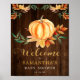 Placa de boas-vindas de baby shower com pequena abóbora laranja em aguarela. Apresentando uma abóbora em aguarela repousando sobre uma cama de folhas coloridas de outono e fonte "Boas-vindas" em brilho dourado. Personalize este lindo cartaz de boas-vindas da pequena abóbora de forma fácil e rápida.