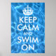 Personalizável "Mantenha a calma e a Natação ligada" com texto branco contra a foto de cor azul da água da piscina de natação.