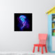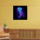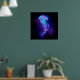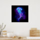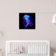 Água-viva grande, azul, desenhada artisticamente, brilhante, brilhante, com longos tentáculos sobre fundo preto com bioluminescência roxa. Água-viva luminosa.