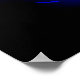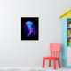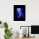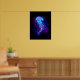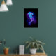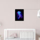 Água-viva grande, azul, desenhada artisticamente, brilhante, brilhante, com longos tentáculos sobre fundo preto com bioluminescência roxa. Água-viva luminosa.