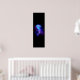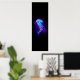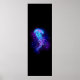 Água-viva grande, azul, desenhada artisticamente, brilhante, brilhante, com longos tentáculos sobre fundo preto com bioluminescência roxa. Água-viva luminosa.