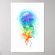 Água-viva grande, iridescente, desenhada artisticamente, brilhante, com longos tentáculos em branco, pintada sobre fundo de aquarela multicolorido. Água-viva arco-íris.