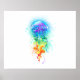 Água-viva grande, iridescente, desenhada artisticamente, brilhante, com longos tentáculos em branco, pintada sobre fundo de aquarela multicolorido. Água-viva arco-íris.