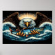 Uma águia poderosa segura graciosamente um peixe brilhante em seus talões agudos contra um céu azul claro, mostrando suas impressionantes habilidades de caça.