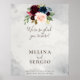 Felicite o seu clássico evento de casamento com isso. Estamos tão felizes que esteja aqui poster de boas-vindas minimalistas. O design apresenta lindas flores rosa, pincéis, azuis, marinhos e burgundy pintadas manualmente com folhas verdes, bem agrupadas em buquês elegantes para embelezar seus cartões de convite para eventos.